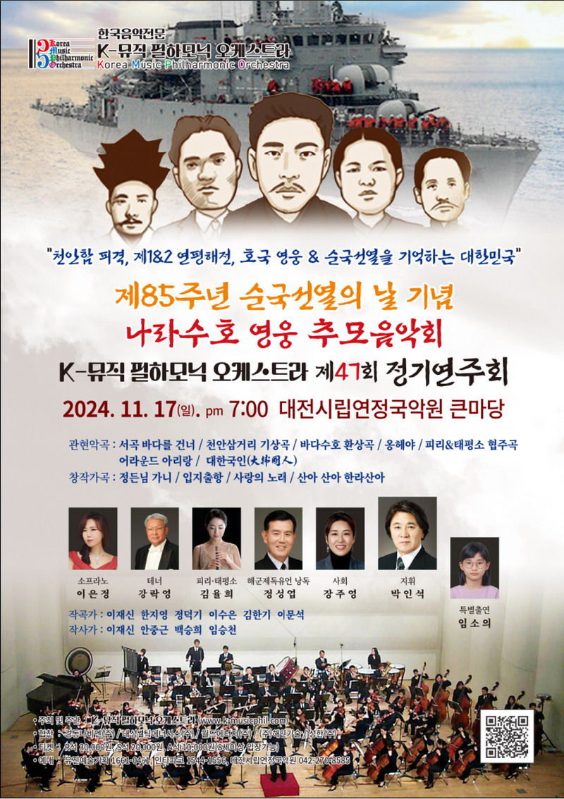 -.¿¬ÁÖȸ ¸í : ¡°Ãµ¾ÈÇÔ ÇǰÝ, Á¦1&2 ¿¬ÆòÇØÀü, È£±¹ ¿µ¿õ ¹× ¼ø±¹¼±¿À» ±â¾ïÇÏ´Â ´ëÇѹα¹¡± Á¦85Áֳ⠼ø±¹¼±¿ÀÇ ³¯ ±â³ä, ³ª¶ó¼öÈ£ ¿µ¿õ Ã߸ðÀ½¾Çȸ ºñ¿µ¸®¹Î°£´Üü K-¹ÂÁ÷ ÇÊÇϸð´Ð ¿ÀÄɽºÆ®¶ó Á¦47ȸ Á¤±â¿¬ÁÖȸ -.¿¬ÁÖÀå¼Ò ¹× ÀϽà : 2024. 11. 17. 7½Ã ´ëÀü½Ã¸³¿¬Á¤±¹¾Ç¿ø Å«¸¶´ç